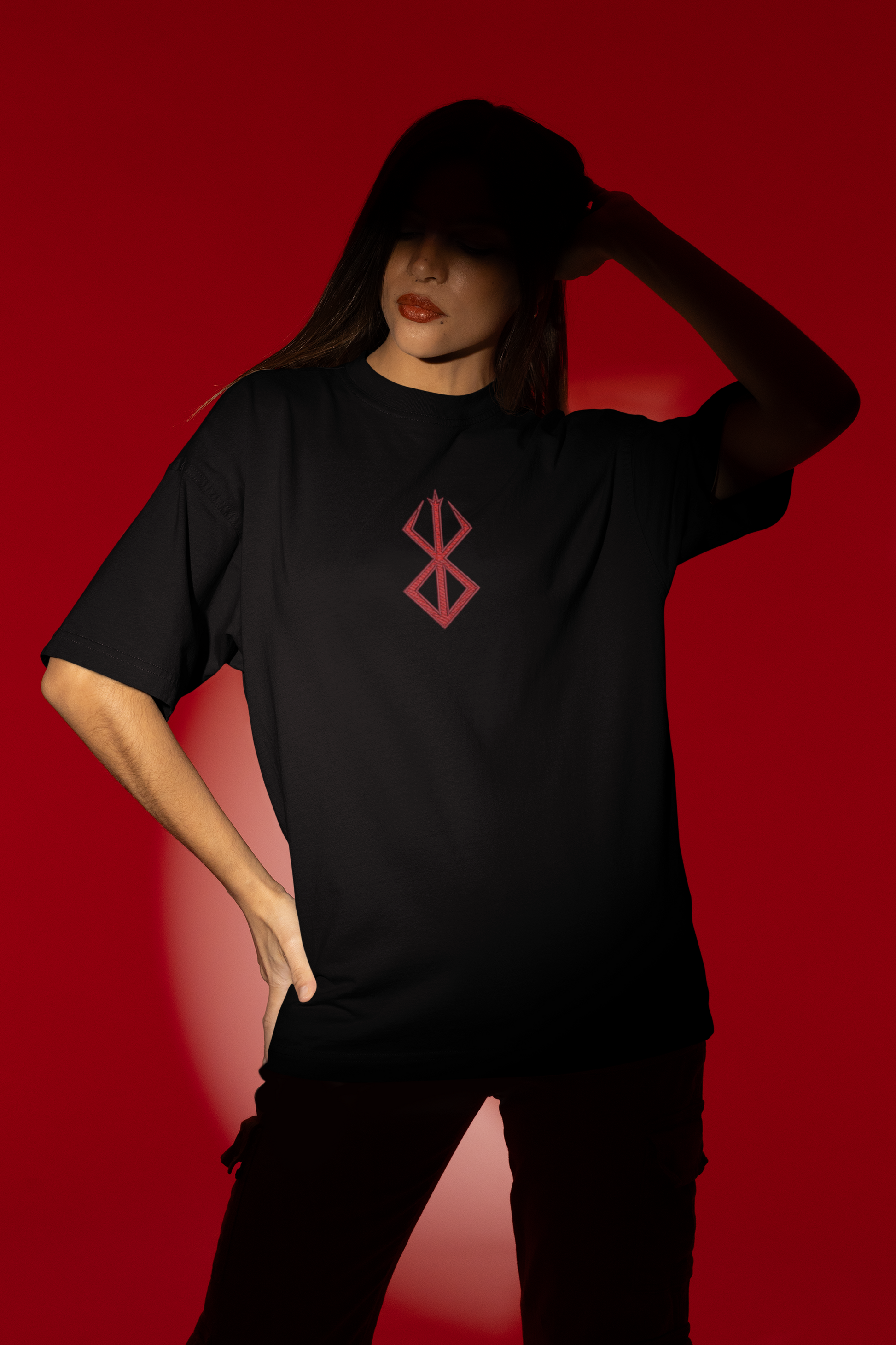 Minimaliste et puissant, ce t-shirt oversize rend hommage à l’œuvre légendaire de Kentaro Miura. La broderie rouge contraste avec le tissu noir pour une présence visuelle intense. C’est un clin d’œil discret aux fans qui reconnaîtront instantanément ce symbole emblématique.