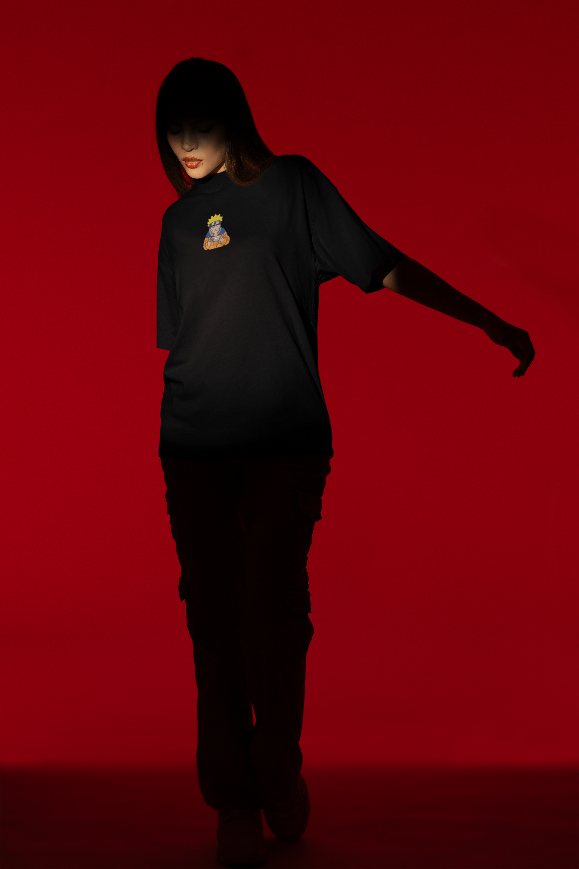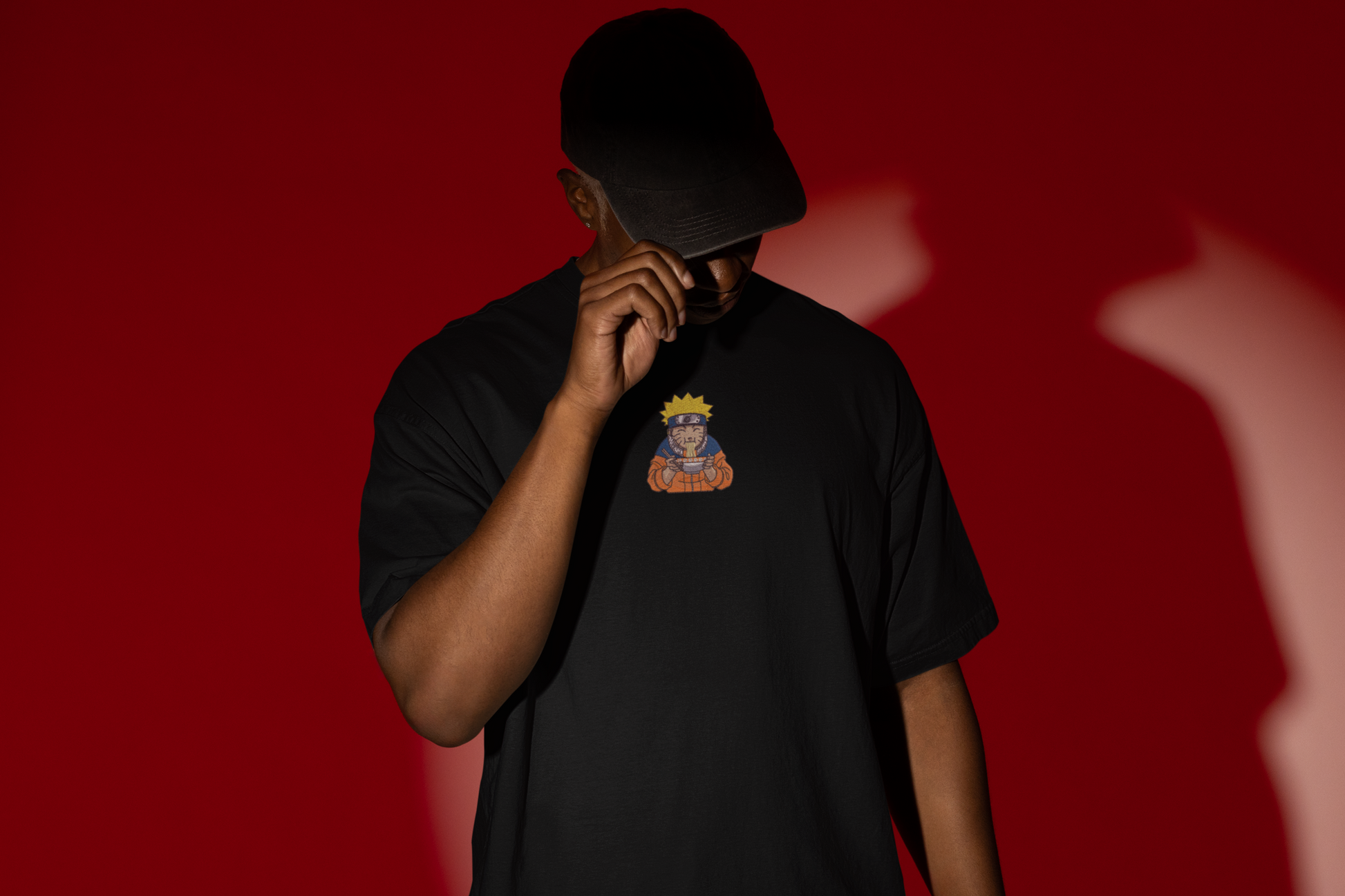 Naruto, heureux avec son bol de ramen. Une scène culte et douce brodée sur la poitrine.